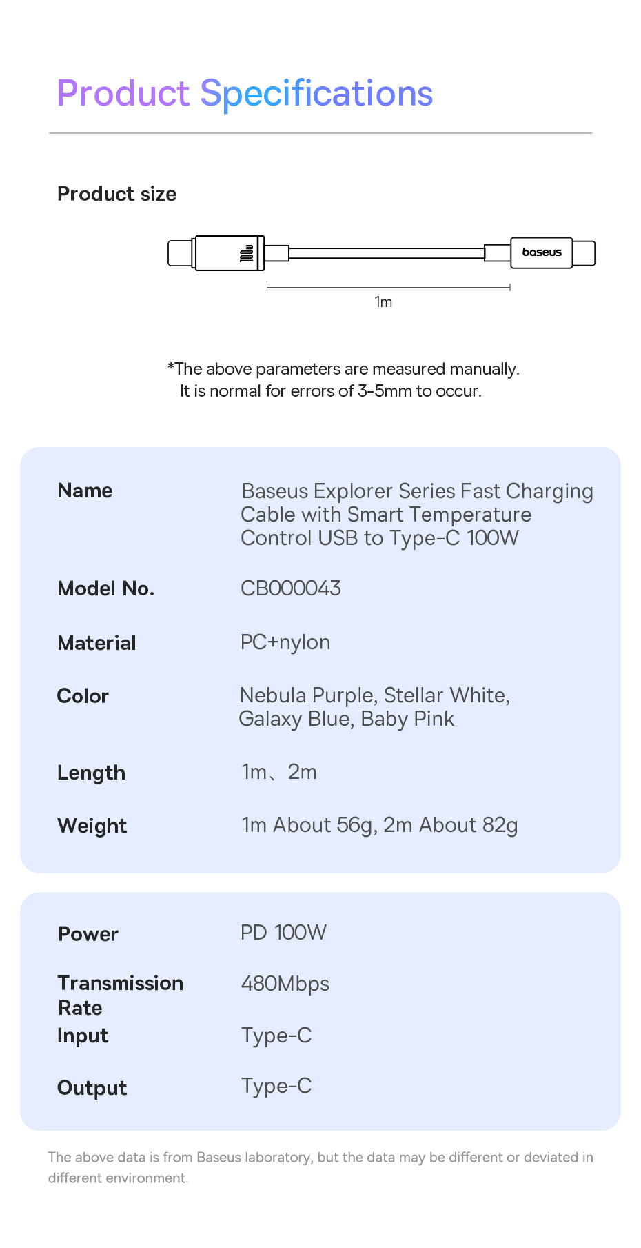 | Tên | Cáp Sạc Nhanh Baseus Explorer Series Fast Charging Cable with Smart Temperature Control Type-C to Type-C 100W |