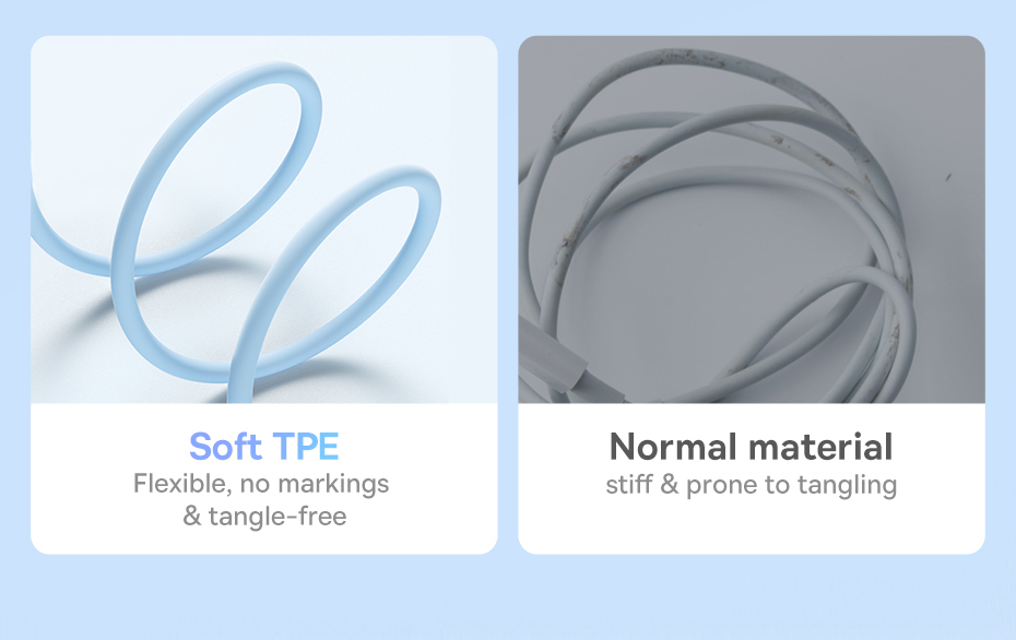 🍮 Chất Liệu Mềm Mịn, Cảm Giác Cao Cấp: Vỏ cáp được làm từ vật liệu TPE/Silicone đặc biệt, cho cảm giác cầm nắm cực kỳ mềm mại và mượt mà. Chất liệu này không chỉ dẻo dai mà còn chống bám bẩn và chống rối hiệu quả.