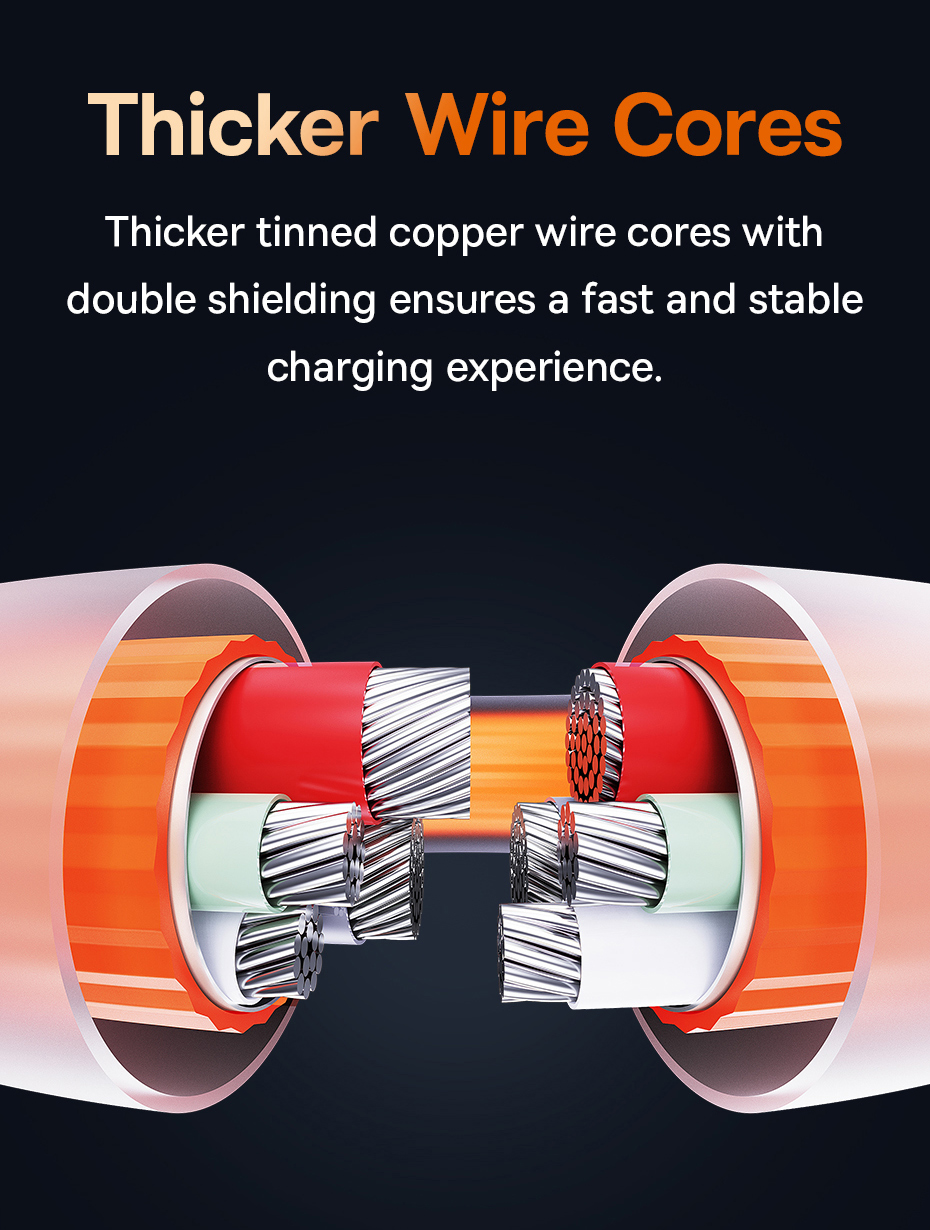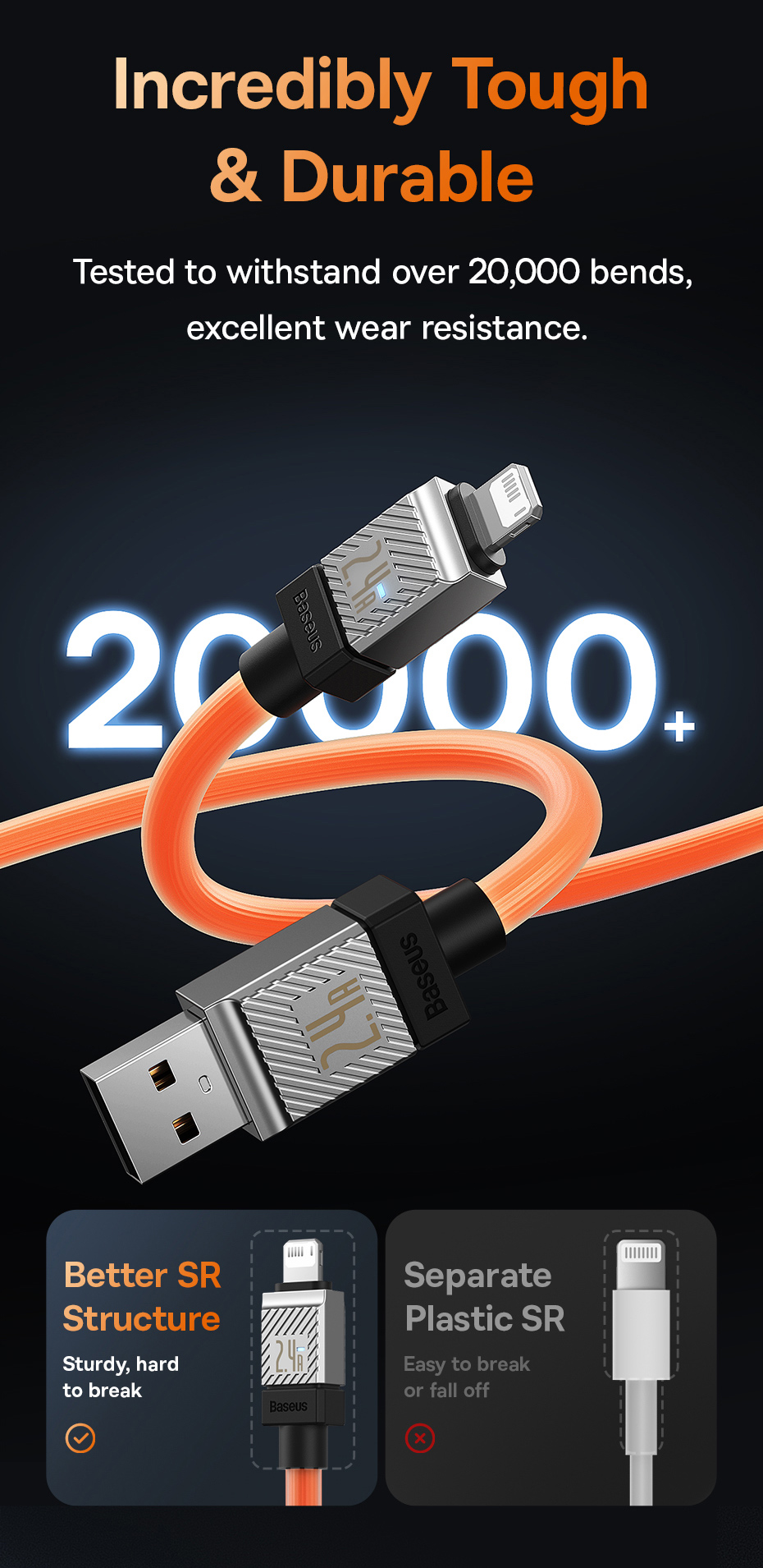 💪 ĐỘ BỀN VƯỢT TRỘI - CHỊU UỐN GẬP HƠN 20,000 LẦN: Được thiết kế để trường tồn. Sợi cáp có thân bọc kép bằng TPE dày 6mm (dày hơn cáp thường) và đầu cắm hợp kim kẽm nguyên khối. Cấu trúc này đã vượt qua các bài kiểm tra uốn cong, bẻ gập khắc nghiệt hơn 20,000 lần, đảm bảo khả năng chống đứt gãy vượt trội.
