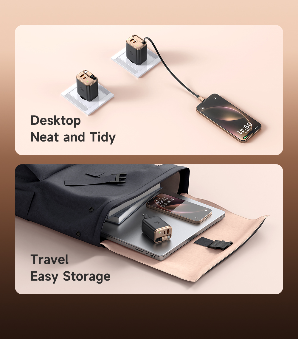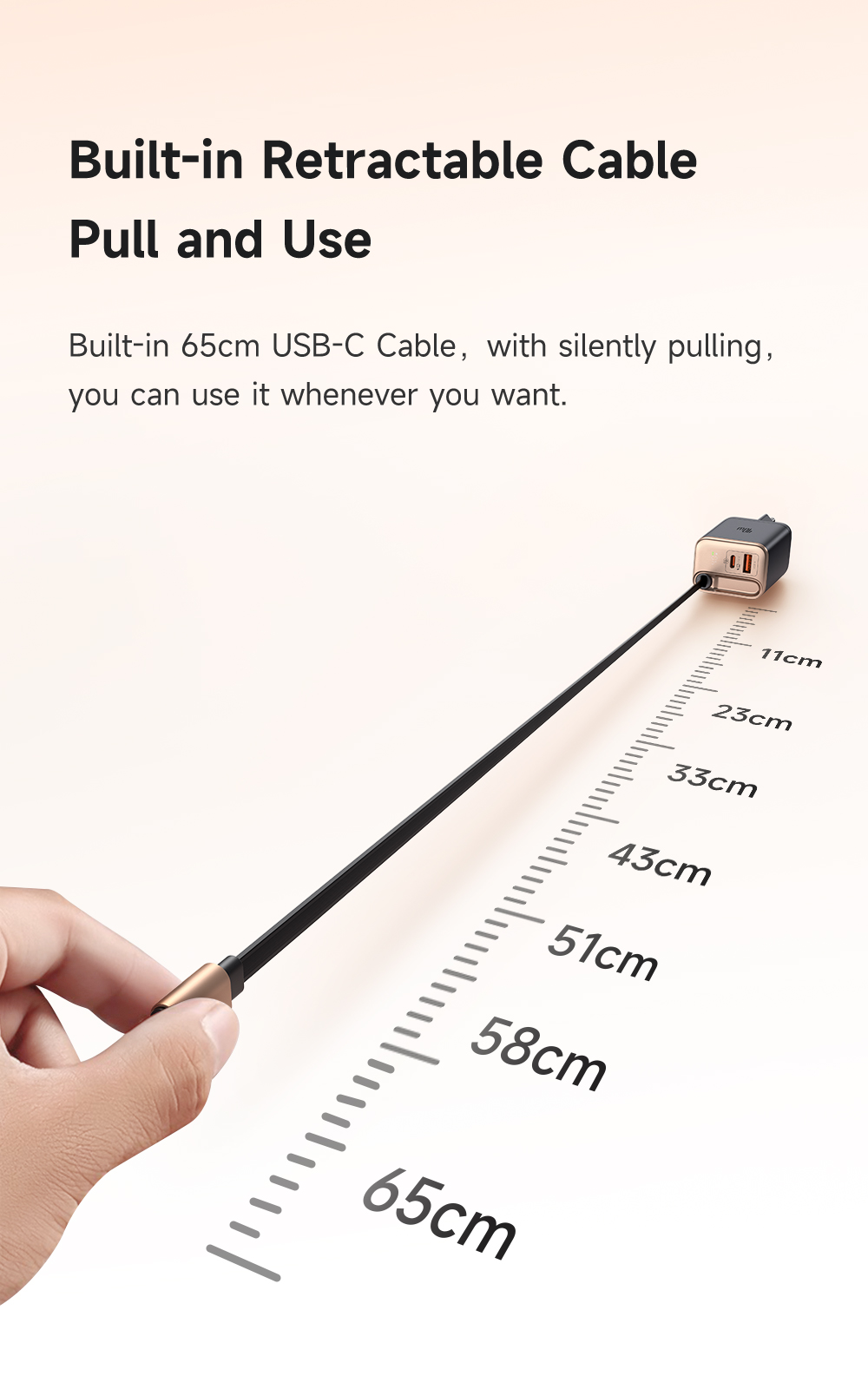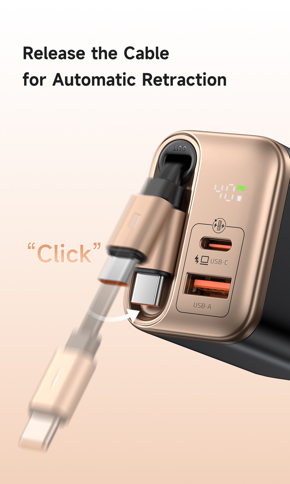 🔗 Tích Hợp Dây Sạc Tự Rút Gọn: Đây là tính năng nổi bật nhất! Nói lời tạm biệt với dây cáp rối! Sợi cáp sạc nhanh được tích hợp ngay trong thân củ sạc và có thể kéo dài ra khi cần. Sau khi dùng xong, chỉ cần bấm nút, cáp sẽ tự động rút gọn lại.