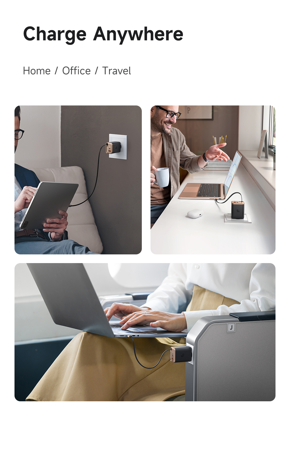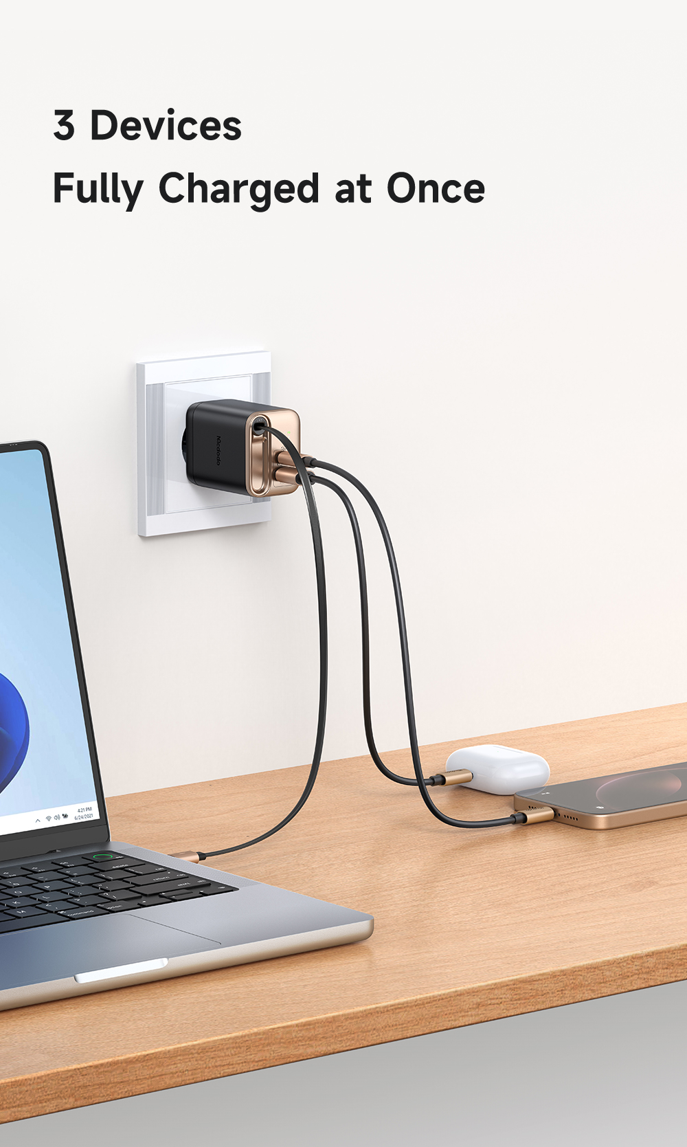💻📱 Sạc Nhanh Cùng Lúc 3 Thiết Bị: Với 1 cáp Type-C tích hợp và 2 cổng sạc nhanh (Type-C & USB), bạn có thể sạc đồng thời cho cả laptop mỏng nhẹ, điện thoại và các phụ kiện khác, đáp ứng mọi nhu cầu năng lượng.