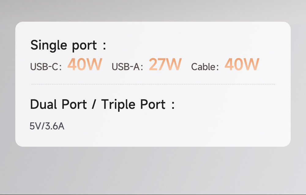 | Type-C Cáp Output | 5V-3A, 9V-3A, 12V-2.91A, 15V-2.33A, 20V-2A 40W |
