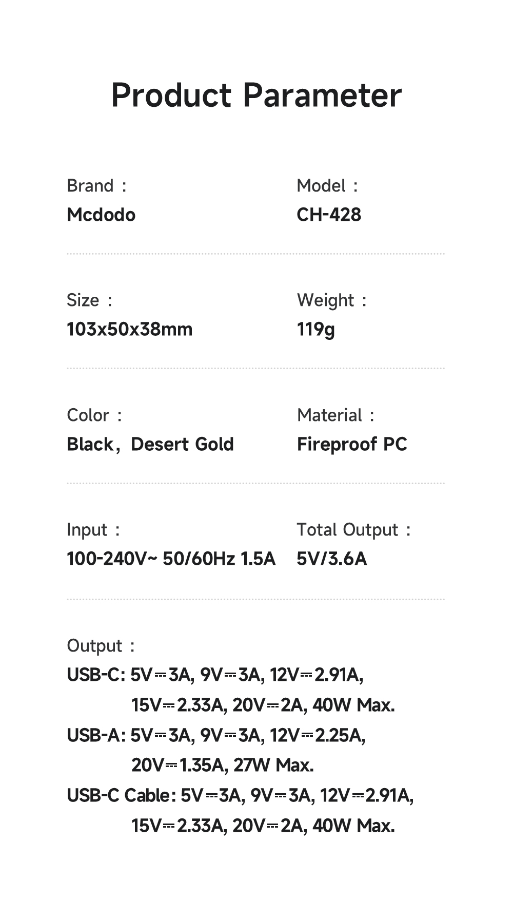 | Type-C Output | 5V-3A, 9V-3A, 12V-2.91A, 15V-2.33A, 20V-3A, 12V-2A 40W |