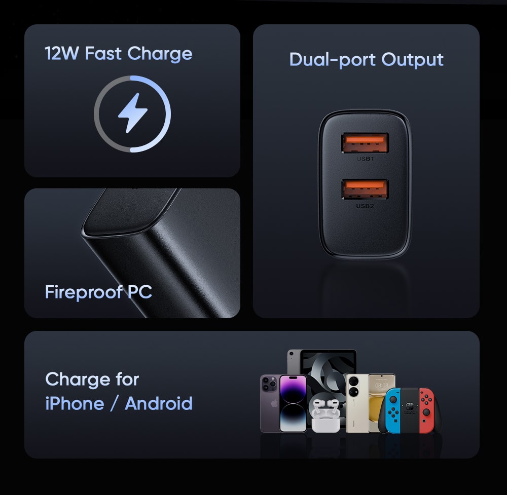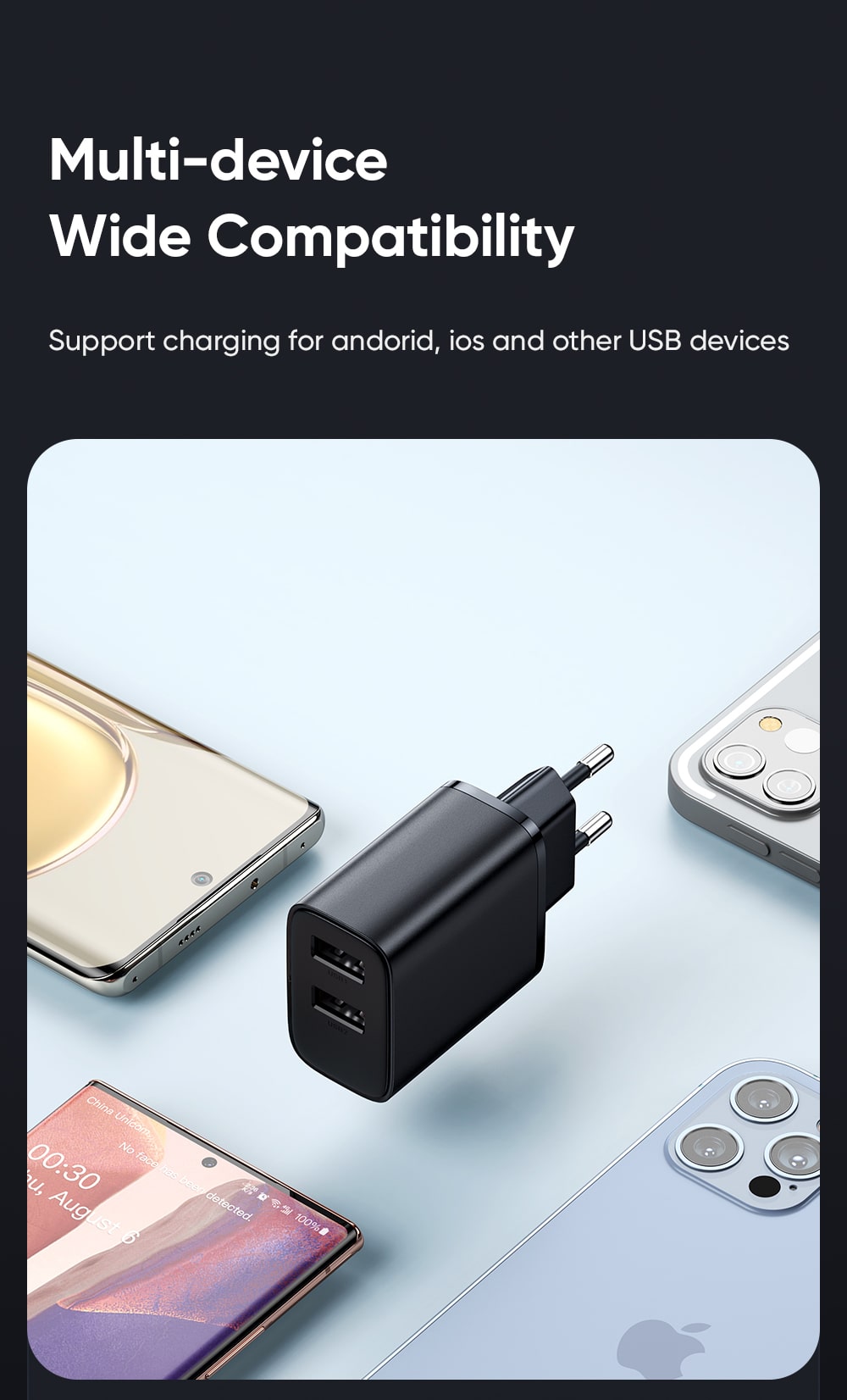 ✌️ Sạc Cùng Lúc 2 Thiết Bị: Với 2 cổng USB, bạn có thể sạc đồng thời 2 điện thoại, hoặc một điện thoại và một phụ kiện (tai nghe, đồng hồ, sạc dự phòng). Tiết kiệm không gian ổ cắm và thời gian chờ đợi.