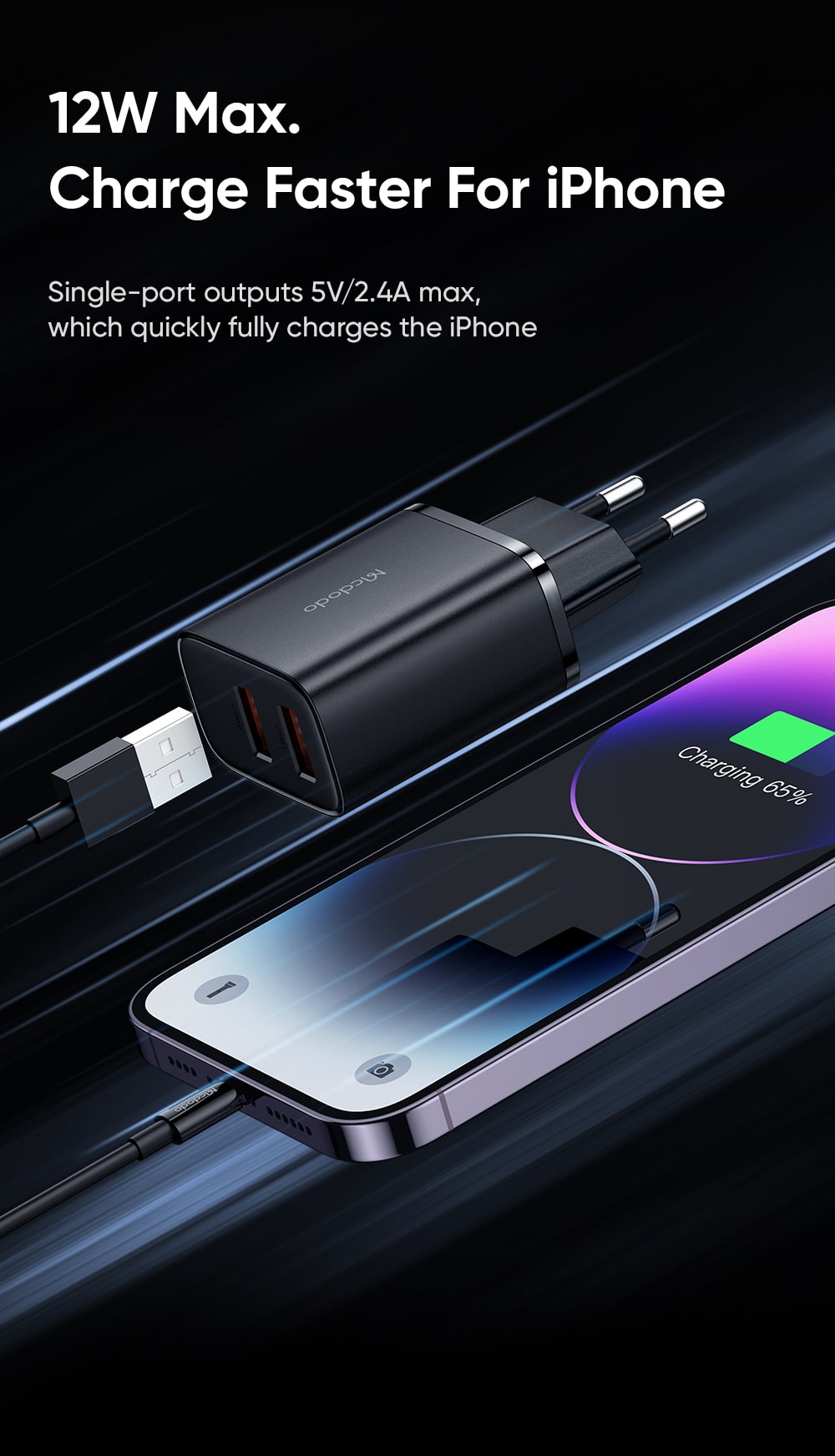 ○ Tổng công suất 12W (5V/2.4A), sạc nhanh hơn sạc 5W.