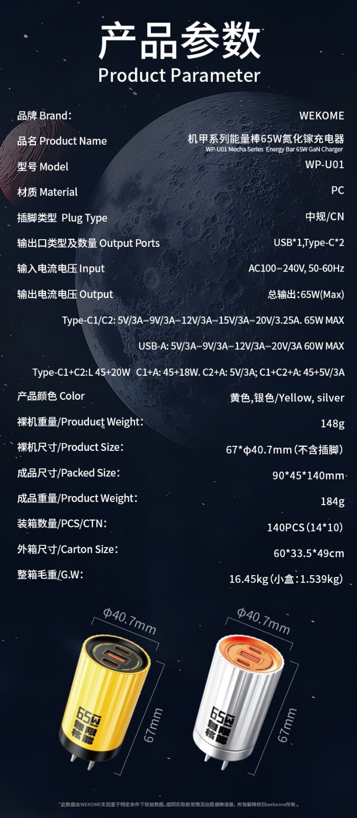 | Tên | Cốc Sac Nhanh Wekome WP-U01 Mecha Series Energy Bar GaN Charger 65W |