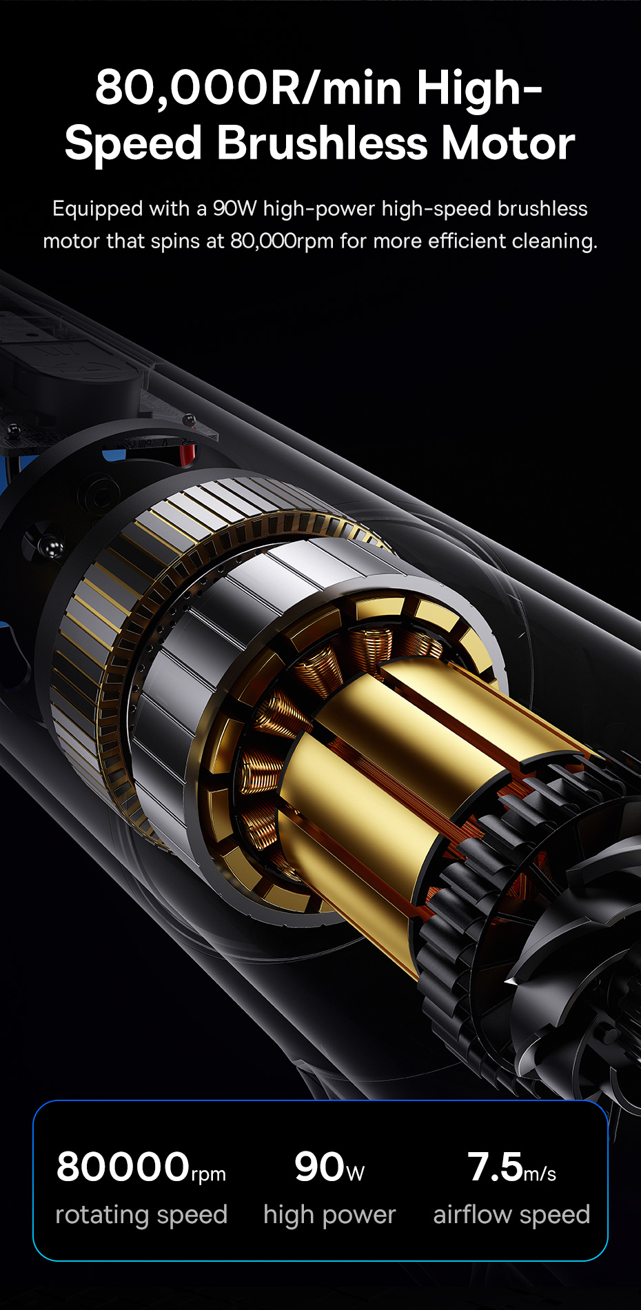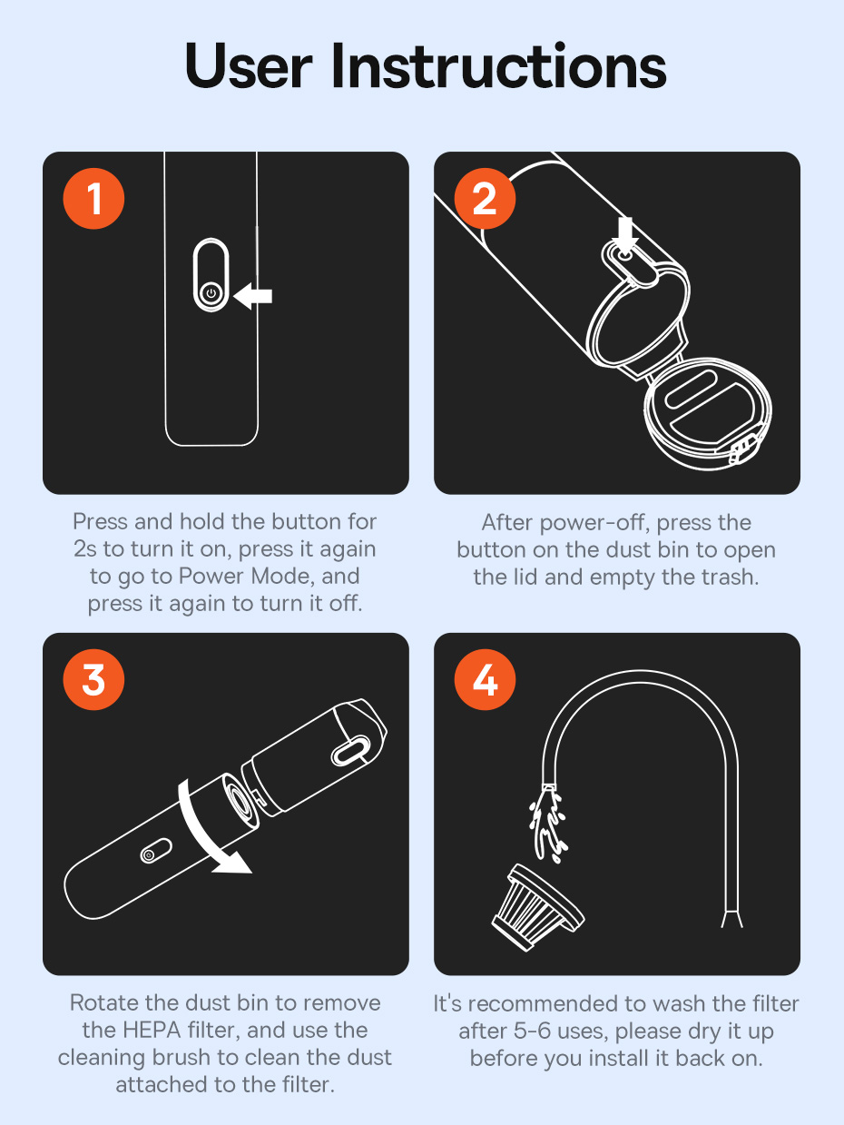 🚀 Lực Hút Cực Mạnh, Sạch Sâu Mọi Bề Mặt: Được trang bị động cơ không chổi than tốc độ cao, máy tạo ra một lực hút cực lớn, dễ dàng hút sạch các loại bụi bẩn, mảnh vụn, tóc và lông thú cưng bị kẹt sâu trong thảm xe, khe ghế và các ngóc ngách.