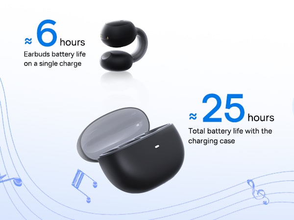 ○ Thời lượng pin: Lên đến 25 giờ (6 giờ cho tai nghe + 19 giờ từ hộp sạc).