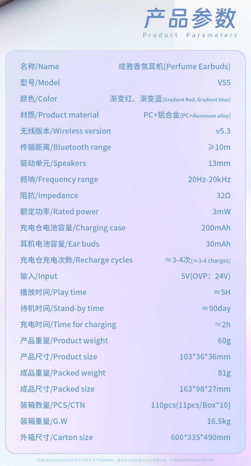 Tai Nghe Bluetooth Wekome Perfume Earphone Perfect Experience V55 Wireless Earphone là một sản phẩm tai nghe không dây độc đáo, mang lại trải nghiệm âm thanh hoàn hảo và thiết kế đặc biệt. Dưới đây là một mô tả chi tiết về sản phẩm: