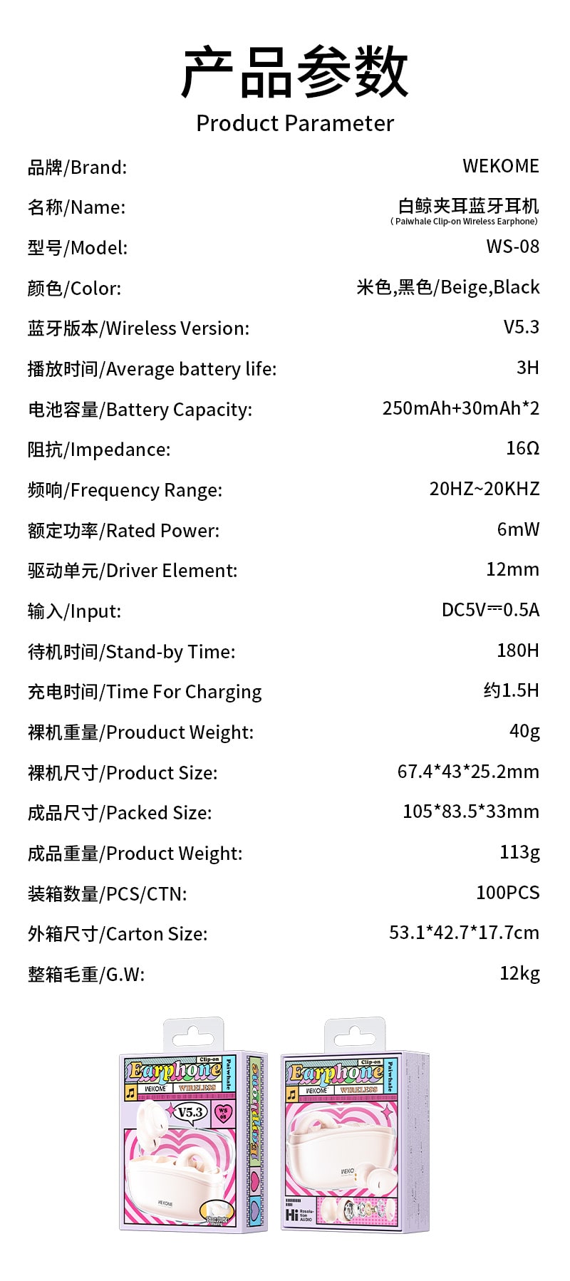 | Tên | Tai Nghe Bluetooth Wekome WS-08 Paiwhale Clip-on Earphone |