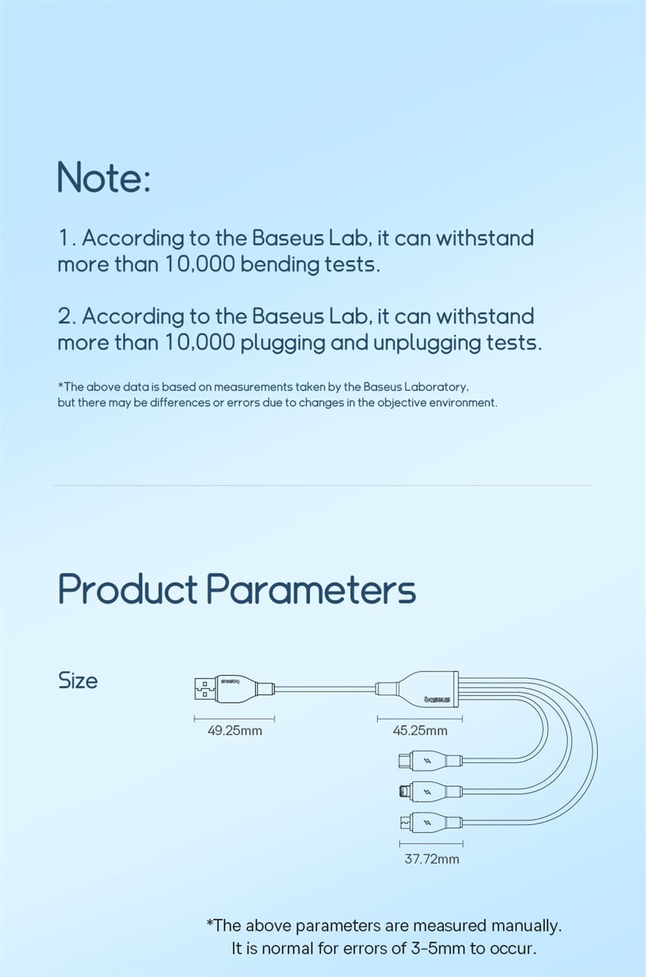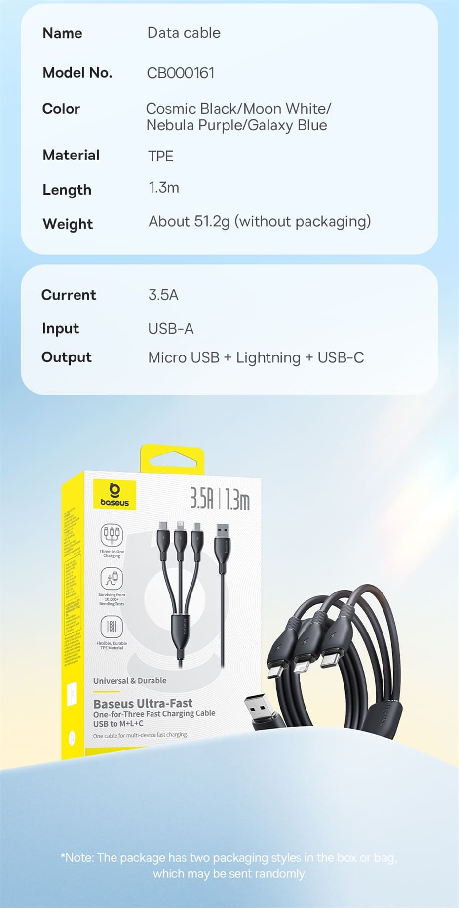 | Tên | Cáp Sạc Đa Năng Baseus Ultra-Fast One-for-Three Fast Charging Cable USB to M+L+C 3.5A |