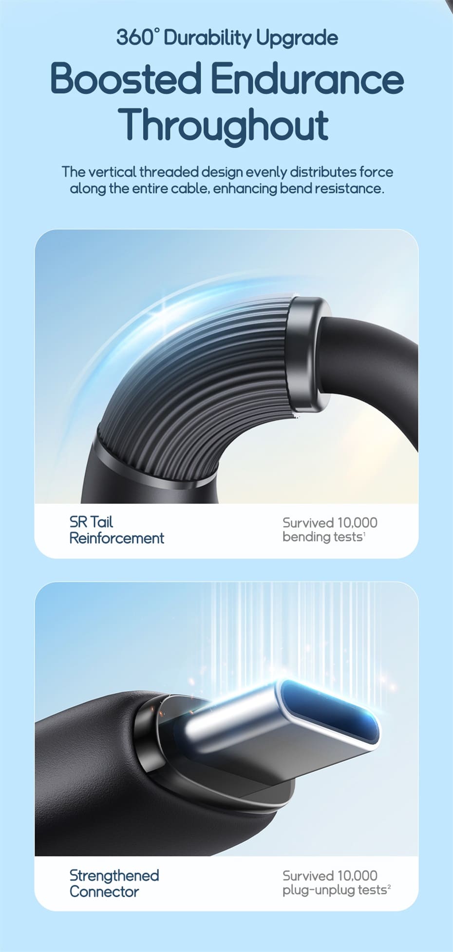 💪 Bền Bỉ Vượt Trội, Chống Gãy Gập: Với lõi dây đồng dày và các khớp nối được gia cố chắc chắn (SR Tail Reinforcement), sợi cáp có độ bền vượt trội, chịu được hàng ngàn lần uốn cong mà không bị đứt gãy.