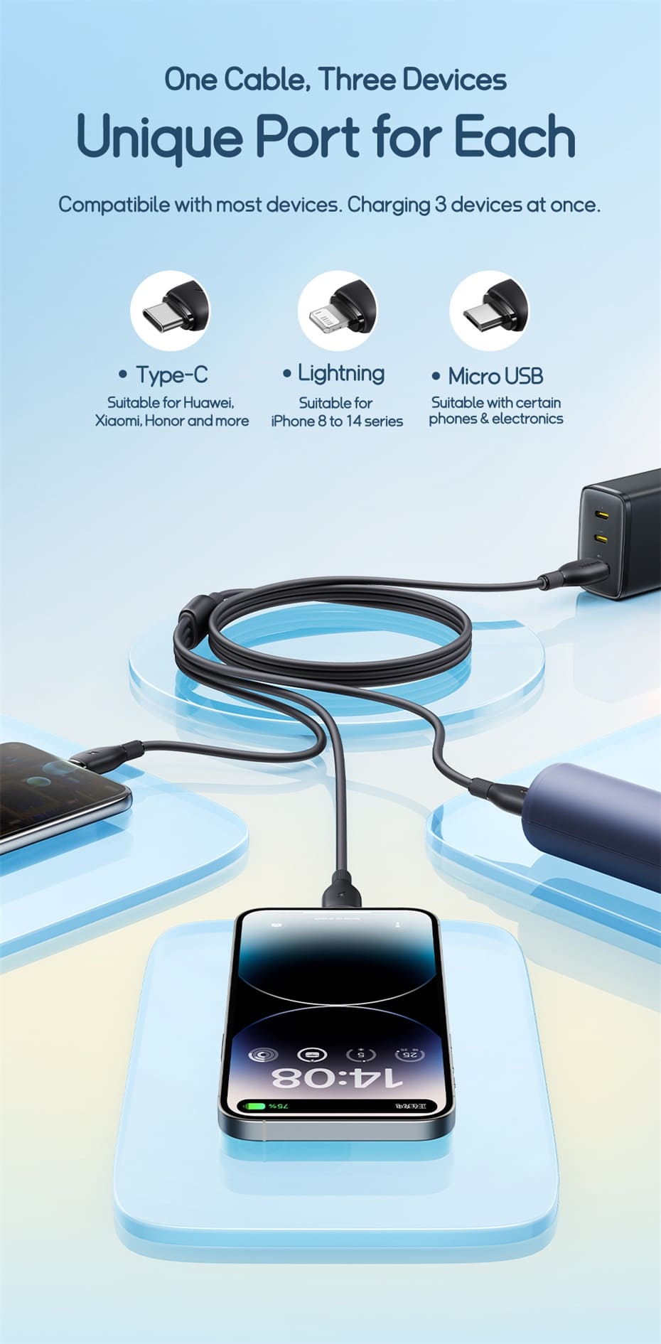 🔌🔌🔌 Một Cáp Cho Mọi Thiết Bị: Trang bị 3 đầu sạc phổ biến nhất: Micro USB, Ln, và Type-C. Sợi cáp duy nhất bạn cần để sạc cho mọi thiết bị, từ điện thoại Android cũ, các dòng máy Ln, cho đến các thiết bị Type-C mới nhất. Hoàn hảo cho gia đình, du lịch và dùng trên ô tô.