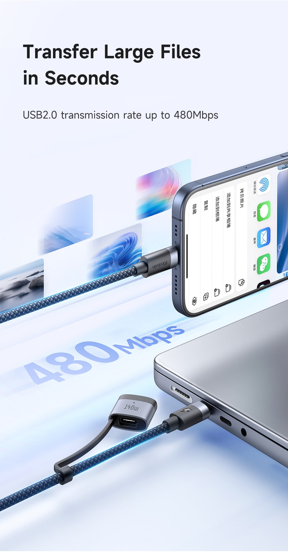 ○ Thiết kế 2 trong 1: Cáp Type-C to Type-C kèm đầu chuyển từ tính có thể tháo rời.