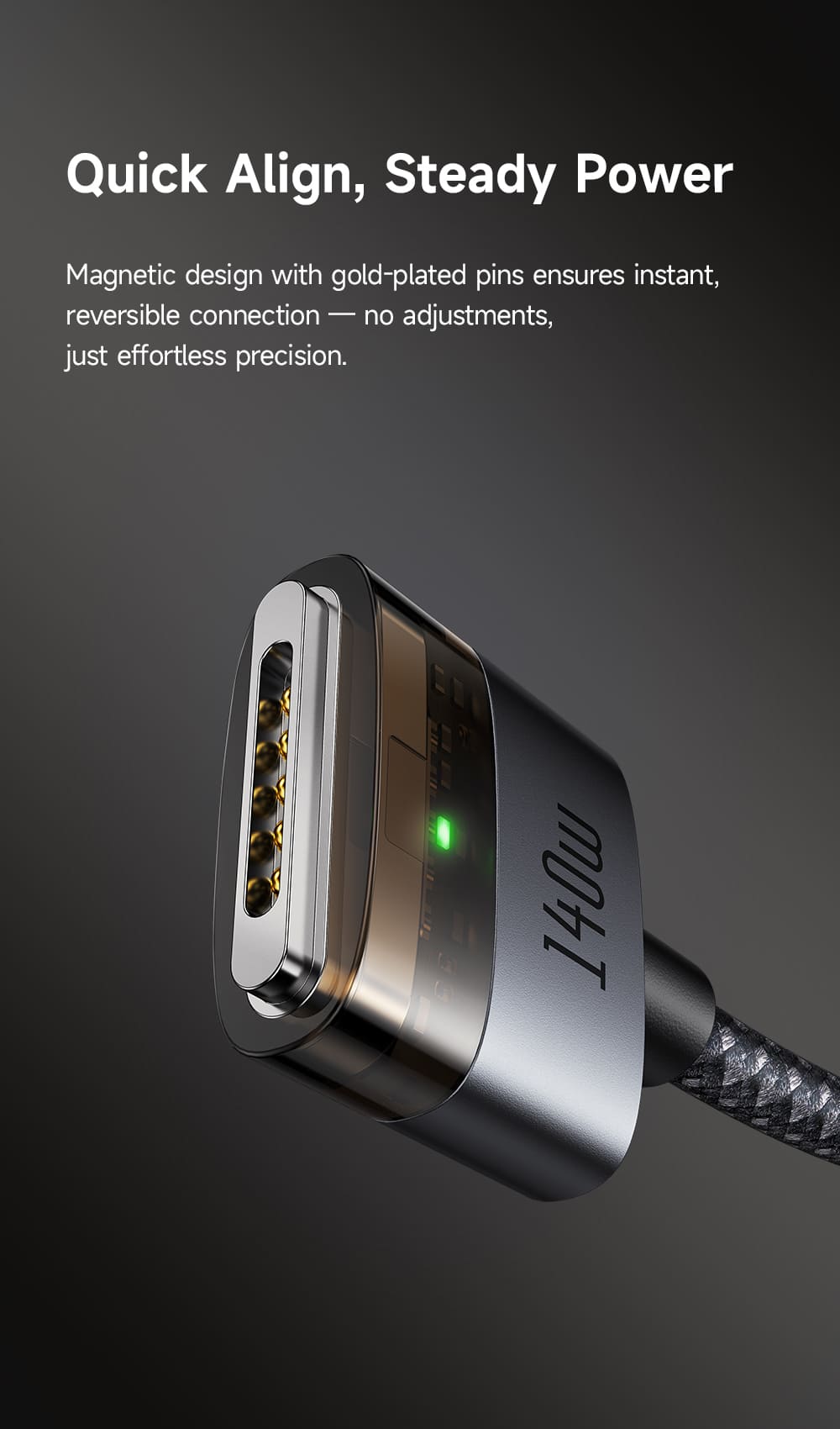 🧲 Kết Nối Từ Tính "Hít" Tức Thì: Trải nghiệm sự tiện lợi tối đa với đầu cắm nam châm. Chỉ cần đưa đầu cáp lại gần cổng sạc trên máy Mac, lực hút từ tính mạnh mẽ sẽ tự động kết nối một cách chính xác và chắc chắn. Cắm sạc chưa bao giờ dễ dàng đến thế.