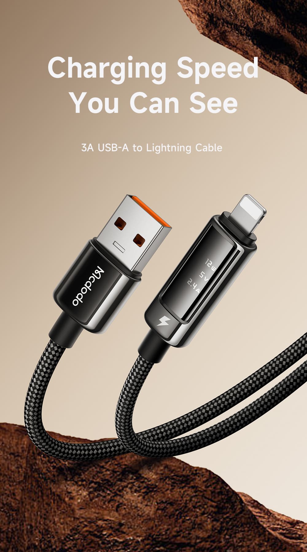 Cáp Sạc Mcdodo Vision Màn Hình OLED | USB to Ln 3A, Hợp Kim Kẽm, Dây Dù