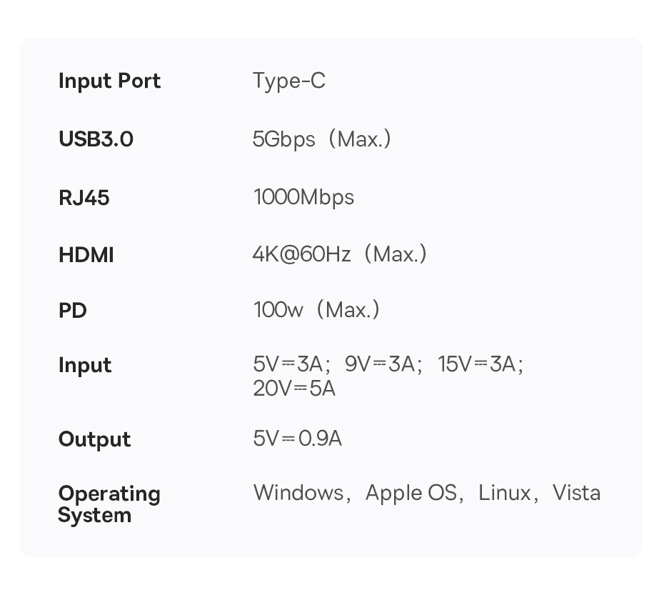 | Input | 5V-3A, 9V-3A, 15V-3A, 20V-5A |