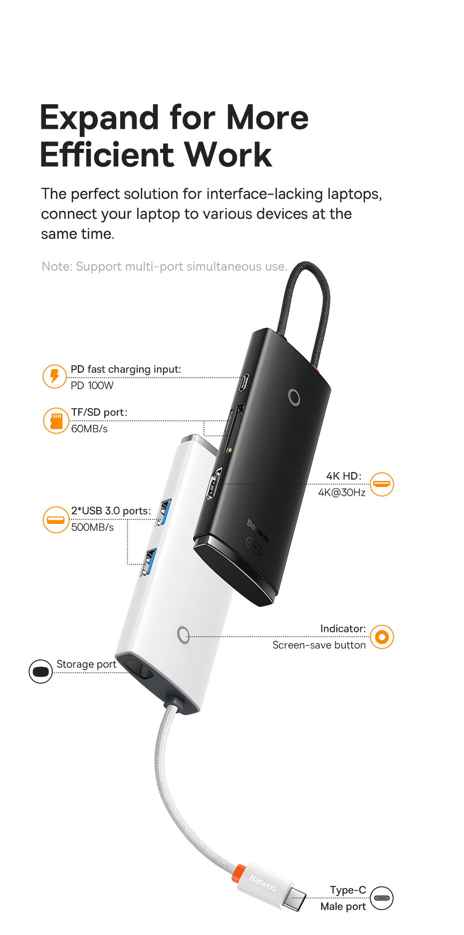 🔗 TRẠM KẾT NỐI 6 TRONG 1 - ĐA NĂNG & TIỆN LỢI: Mở rộng toàn diện khả năng kết nối cho laptop của bạn, bao gồm cổng HDMI 4K, 2 cổng USB 3.0, khe đọc thẻ SD/TF và cổng sạc nhanh PD 100W.