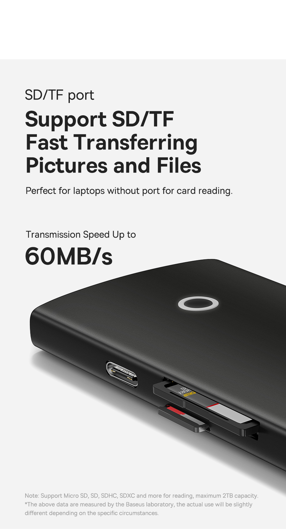 6 Cổng Mở Rộng: Gồm 1x HDMI (4K@30Hz), 1x Type-C PD (100W), 2x USB 3.0 (5Gbps), 1x SD, 1x TF.
