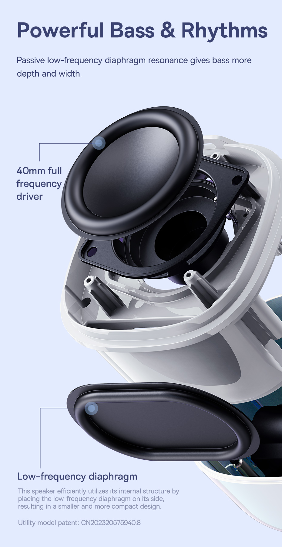 Âm bass mạnh mẽ: Màng loa thụ động và driver 40mm cho âm trầm sâu và uy lực.