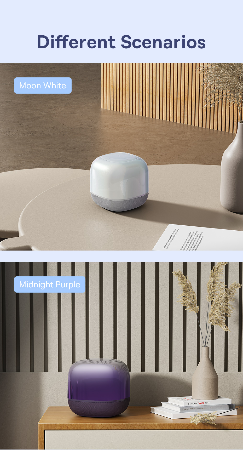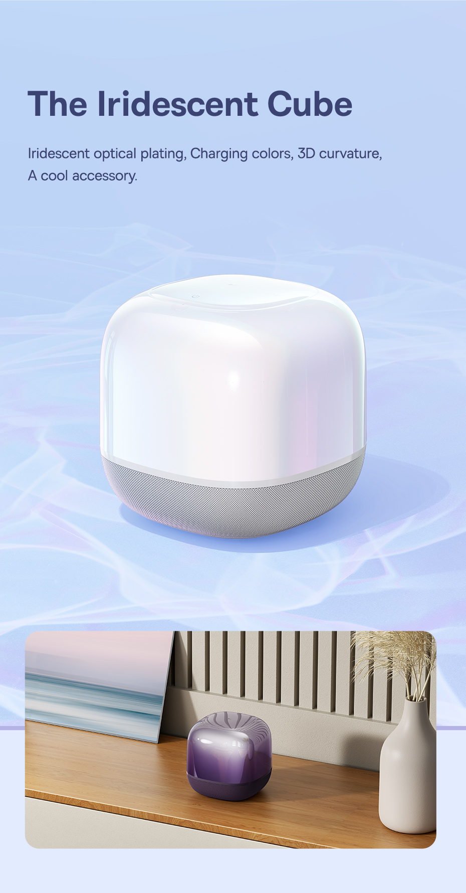 ✨ Thiết Kế "Khối Ma Thuật" Đổi Màu: Lớp vỏ trên được mạ quang học đặc biệt, tạo hiệu ứng màu sắc óng ánh (iridescent) huyền ảo, thay đổi theo từng góc nhìn và ánh sáng, biến chiếc loa thành một "khối ma thuật" trang trí đầy cuốn hút.