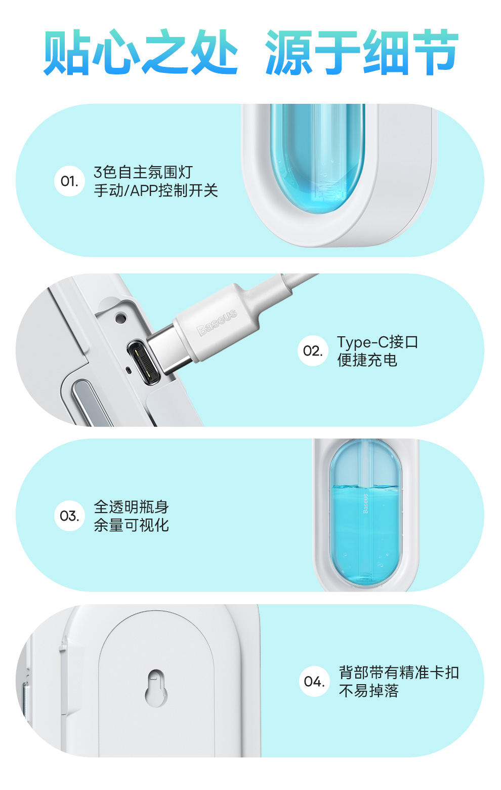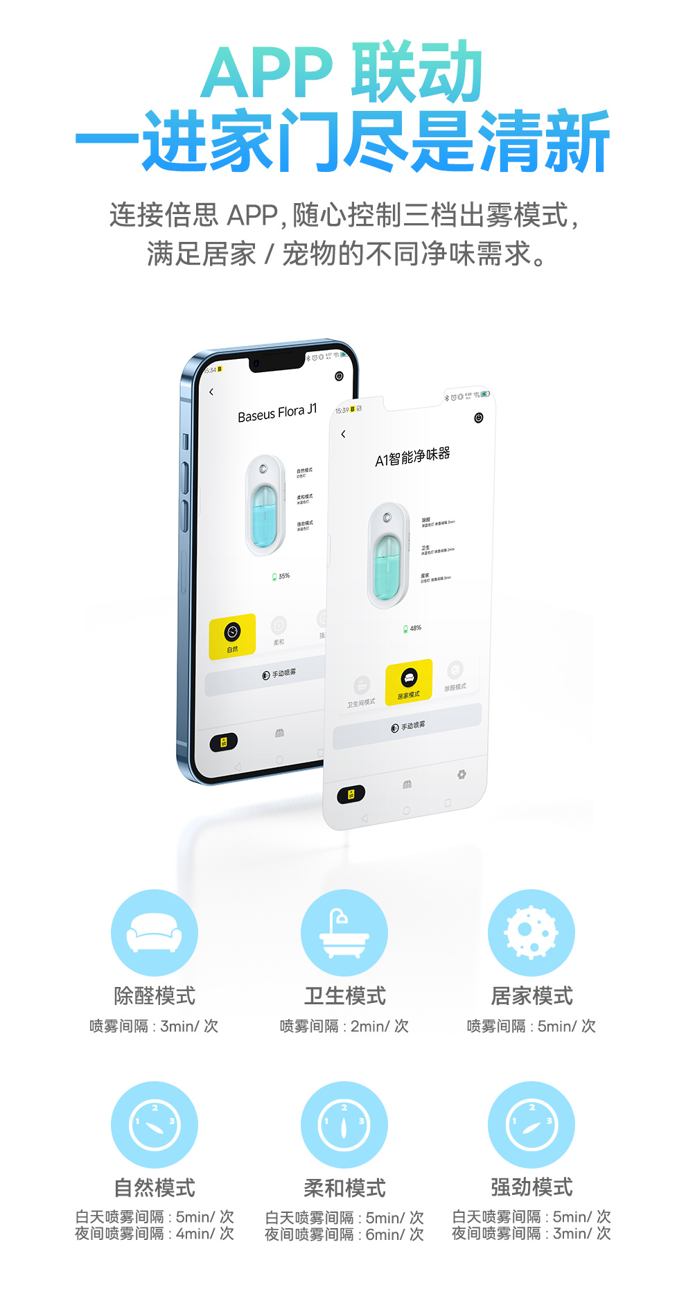 📱 ĐIỀU KHIỂN THÔNG MINH QUA APP: Kết nối với ứng dụng Baseus trên điện thoại để dễ dàng tùy chỉnh chế độ hoạt động. Lựa chọn các chế độ khử mùi chuyên biệt (Nhà vệ sinh, Nhà cửa, Tự nhiên...) hoặc cài đặt tần suất và thời gian phun sương theo ý muốn.